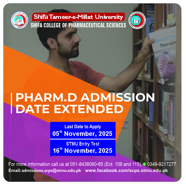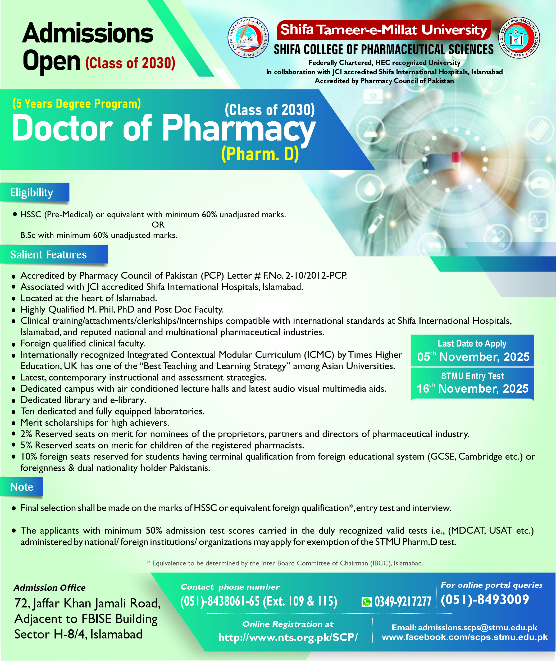 Doctor of Pharmacy Pharm. D - Shifa College of Pharmaceutical Sciences, Shifa Tameer-e-Millat University, Islamabad Class of 2030 Admission Test